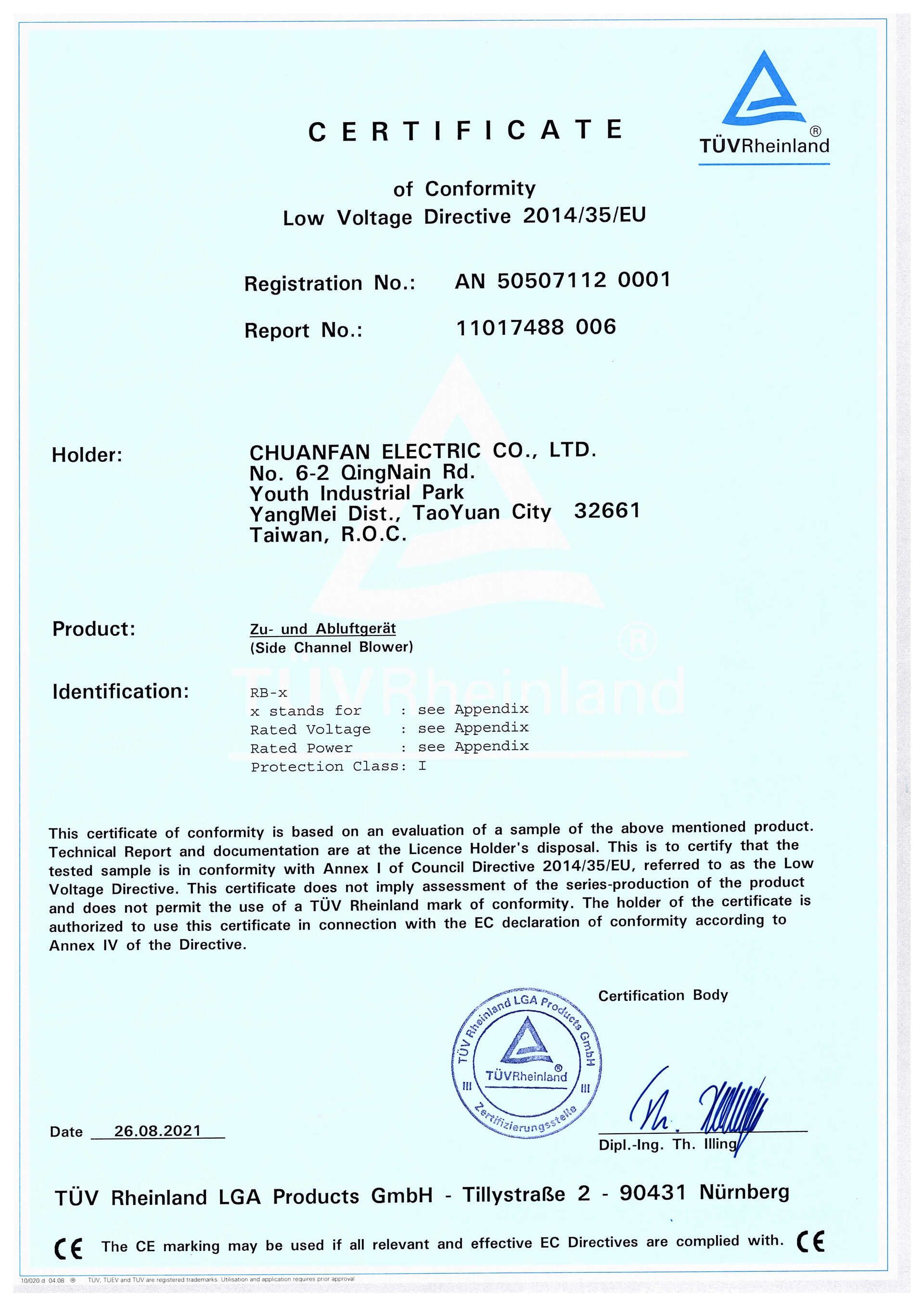 CE Mark サイドチャネルブロワー Low Voltage Directive 2014/35/EU Issuer: TUV Issue Date: 2021/08