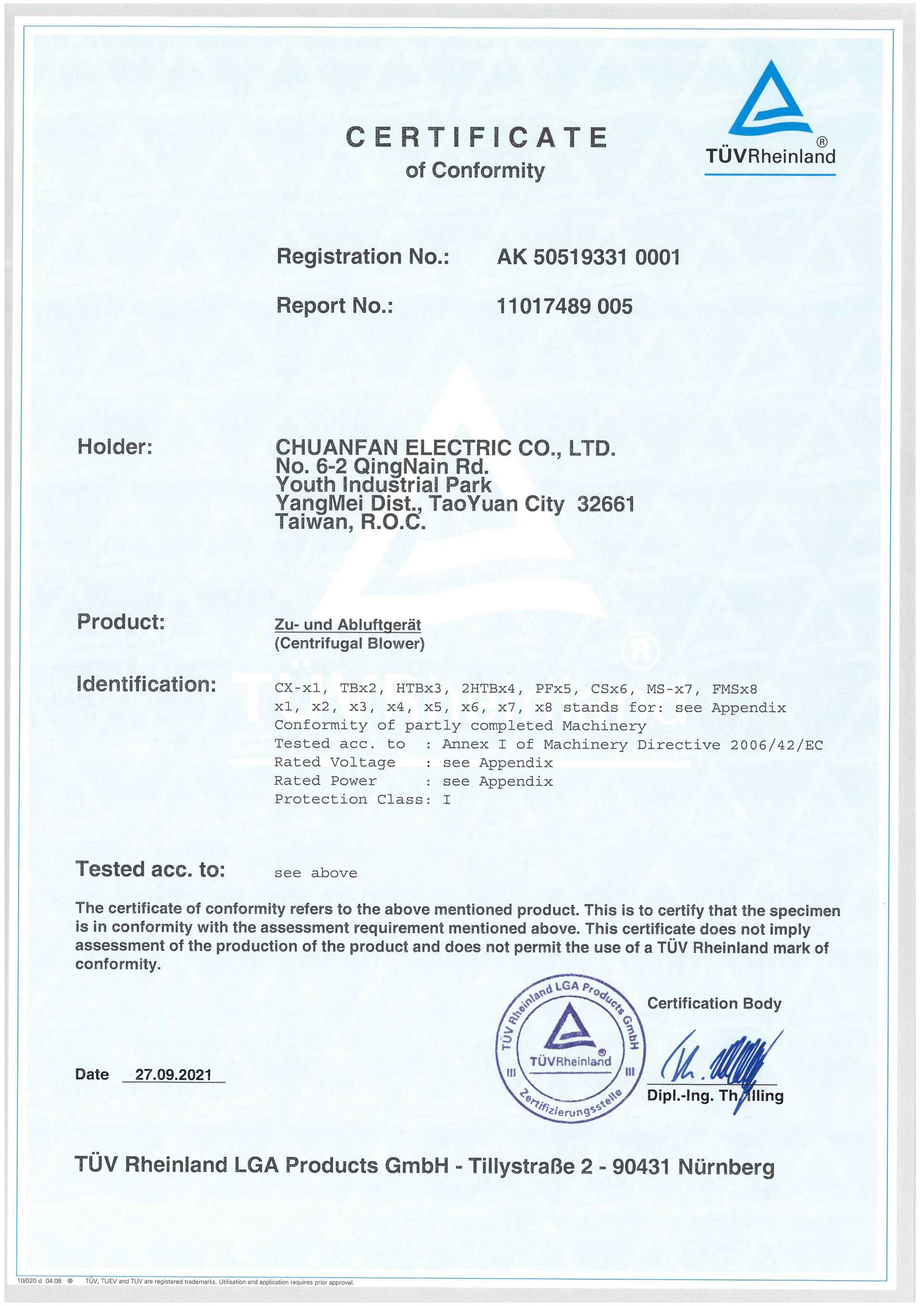 CE Mark 離心式鼓風機 低電壓指令2014/35/EU ∙ 頒發單位: TUV ∙ 頒授日期: 2021/09